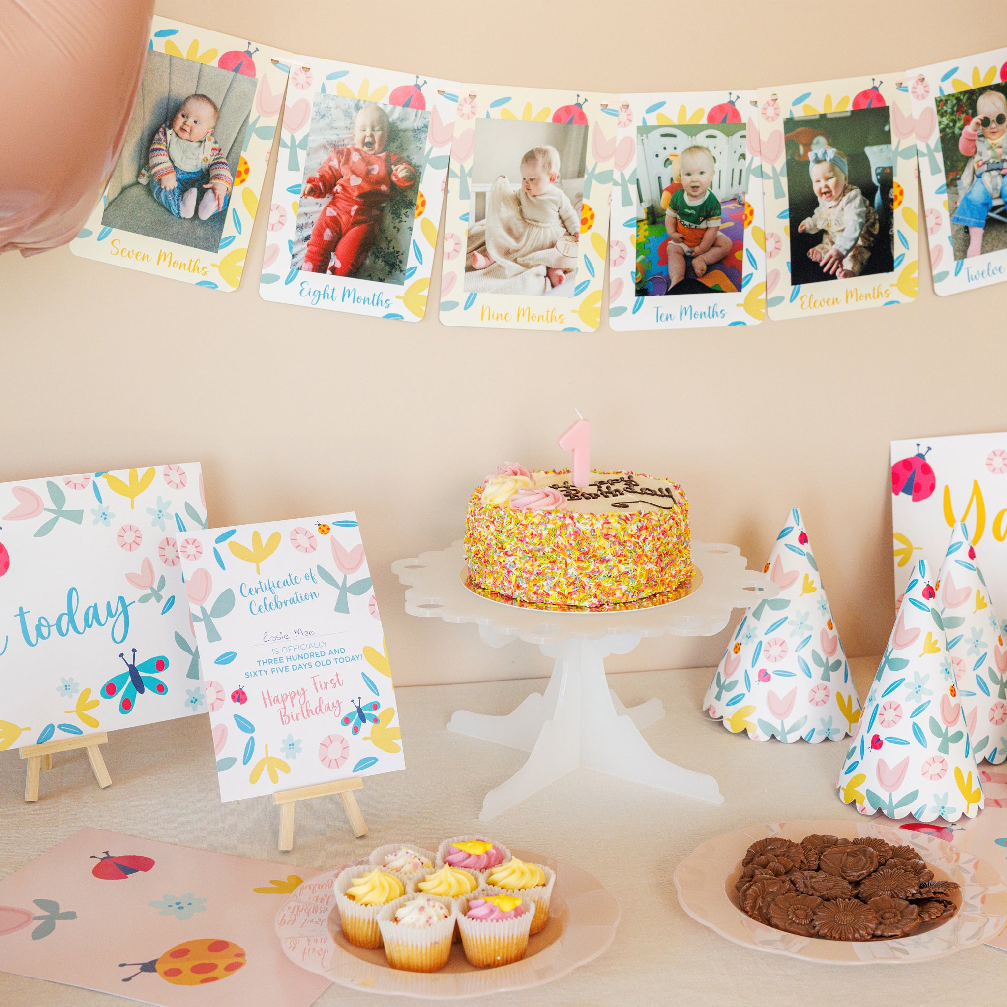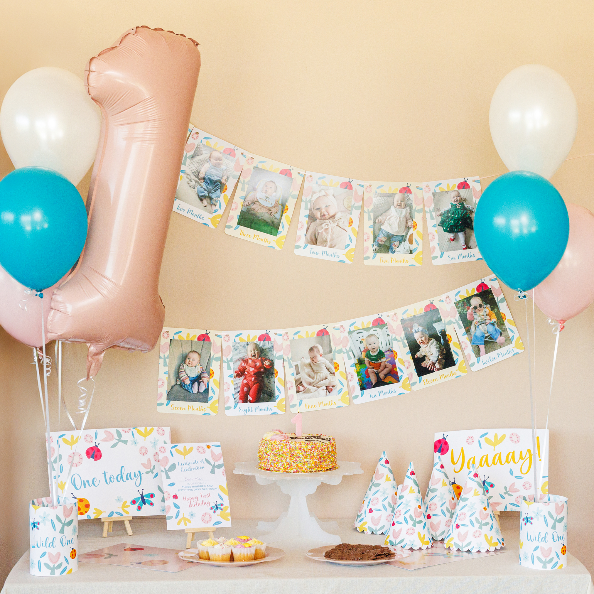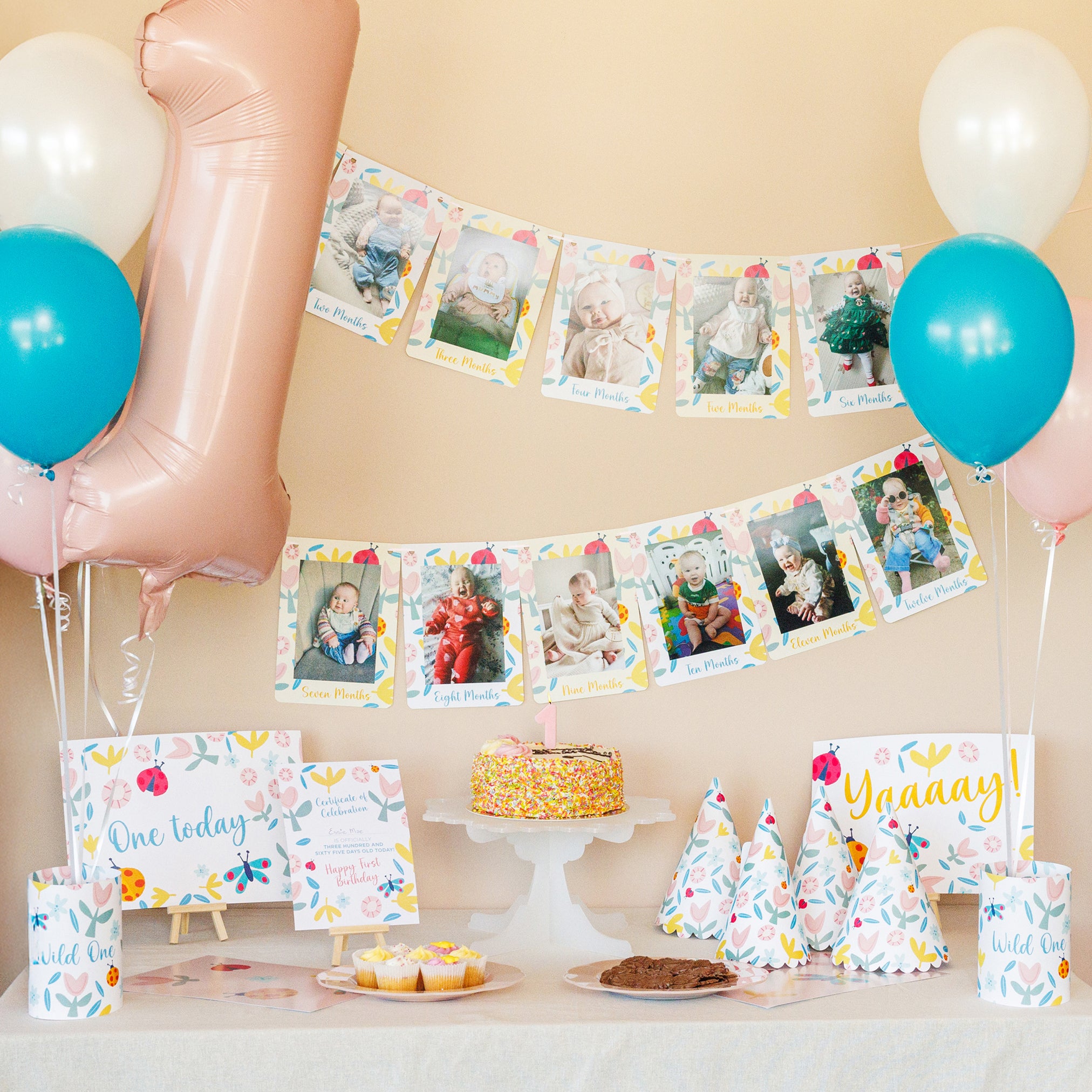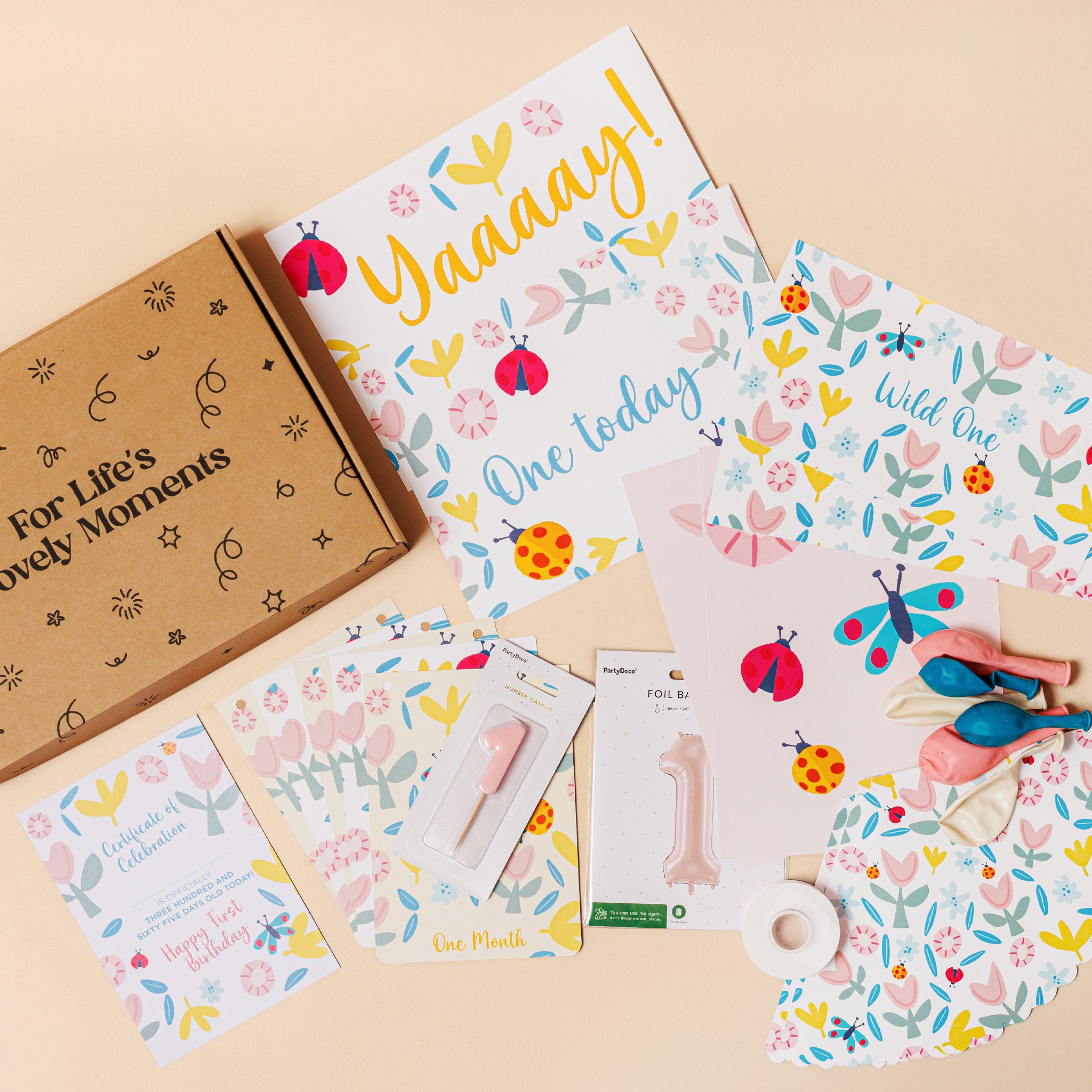 Whether you're planning a small party at home or a special photo moment, this box includes everything you need to decorate your space, mark each month of growth, and create a beautiful birthday keepsake.