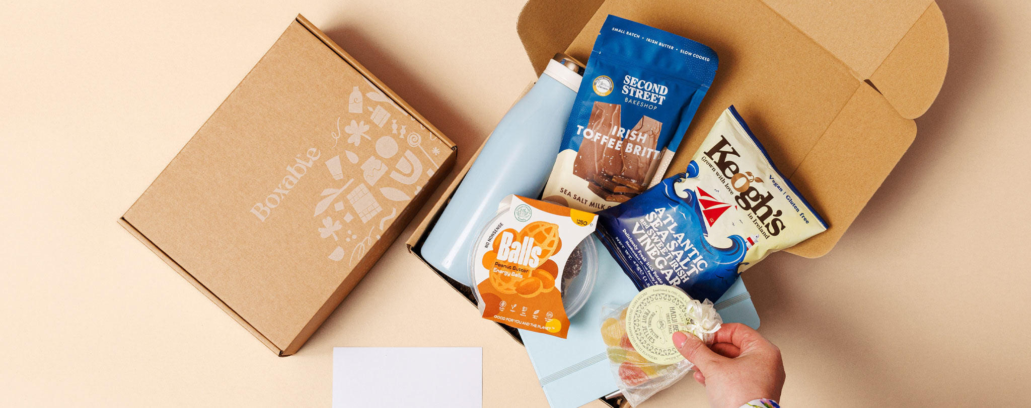 Our gift boxes feature a curated selection of Irish-made products from artisan producers across the country. From handmade chocolates and sweet treats to candles and wellbeing items, each product is selected to create a memorable gifting experience while supporting local makers.