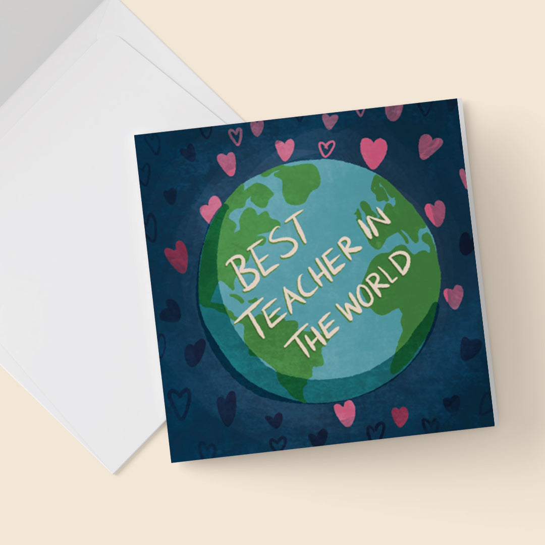 Pay homage to your favourite teacher with our stylish "Best Teacher in the World" card. This hand-drawn card displays admiration and gratitude for those teachers who go the extra mile. Its heartfelt design is a touching token of thanks that recognizes your teacher's dedication to developing minds and making a difference. Give your teacher the recognition they deserve and show your appreciation for their extraordinary influence.