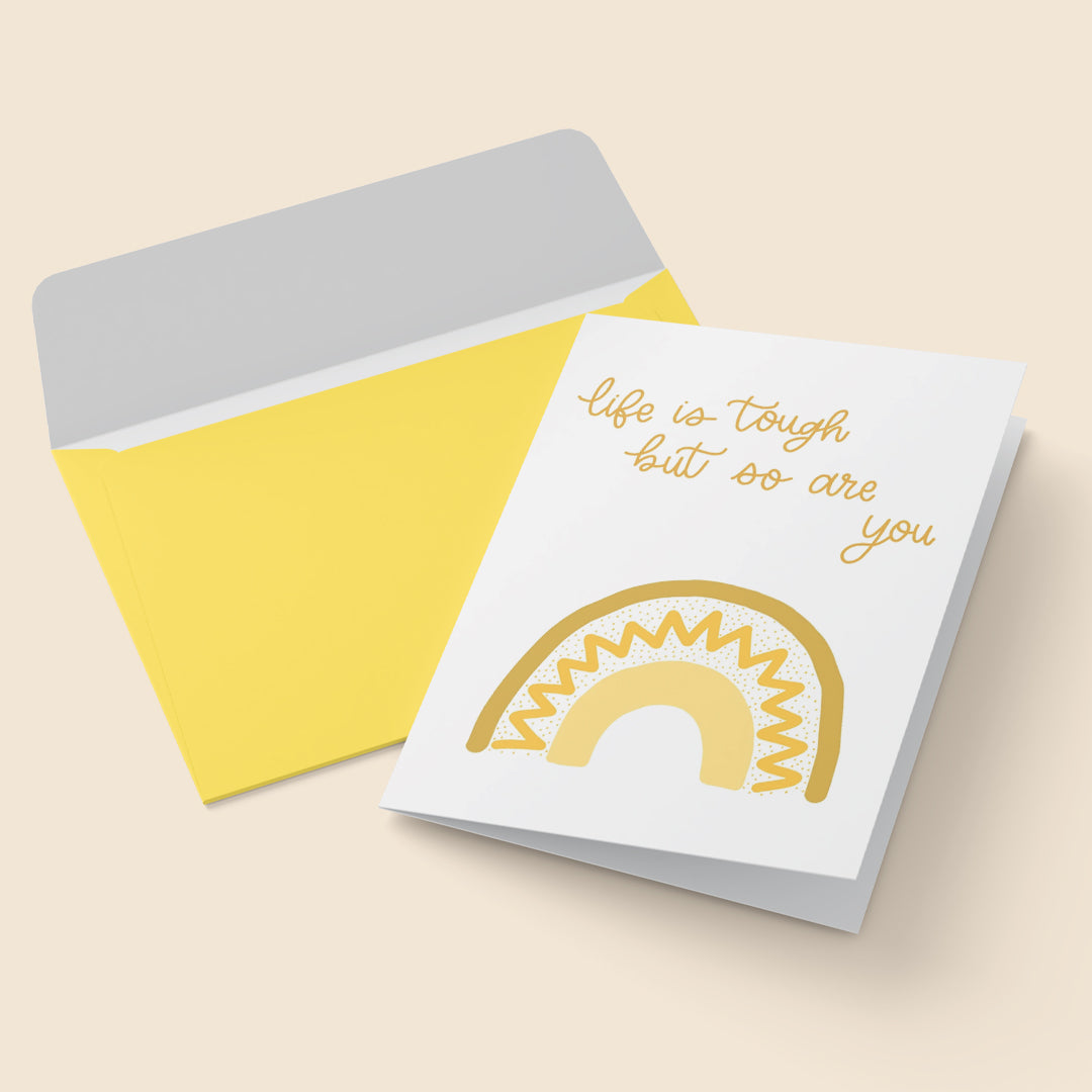 Let your pal or a loved one know they have the courage and determination to tackle the toughest days with our "Life Is Tough, But So Are You" card. This encouraging message accompanied by the inspired meaning of the yellow rainbow will remind them that you're there for them on the good days, the bad days and everything else in between.