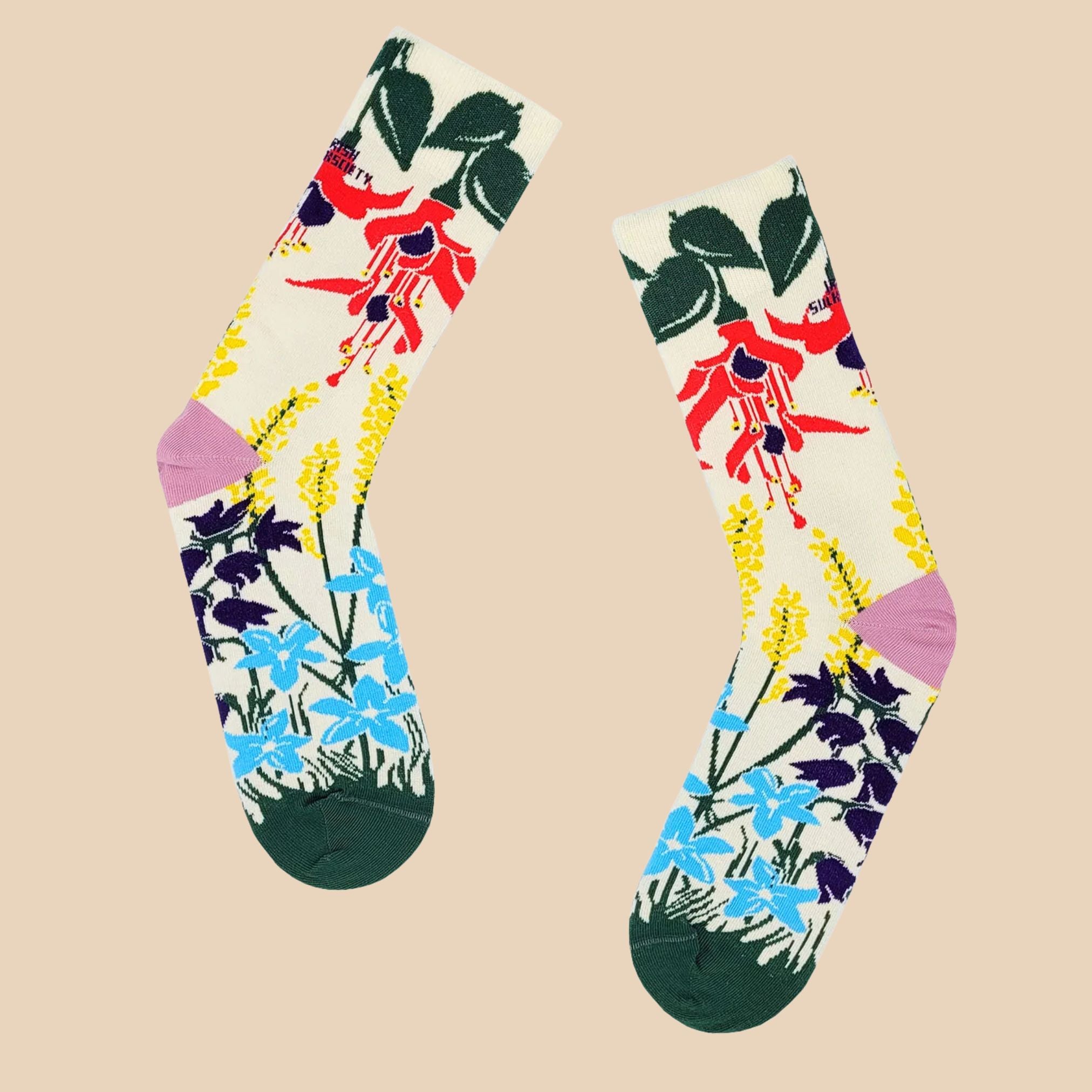 Celebrate the beauty of Ireland’s wild flora with these vibrant, eco-inspired socks. Designed to raise awareness of our environment and the importance of protecting it, this pair is bursting with colour and life featuring Fuchsia, Spring Gentian, Viper’s Bugloss, Lady’s Bedstraw, and Harebell. A wearable tribute to nature’s artistry, they’re as comfortable as they are meaningful. Perfect for nature lovers, eco-advocates, or anyone who appreciates the wild beauty around us.