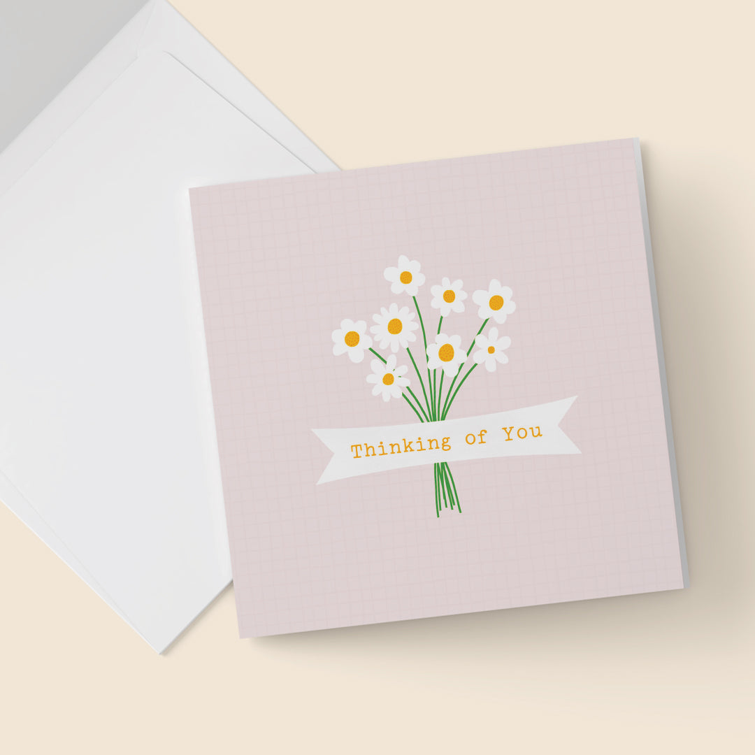 Send heartfelt sentiments with our "Thinking of You" Card, adorned with a delightful illustration of daisies that convey warmth and affection, making it the perfect addition to your gift box to let someone special know they are always in your thoughts.