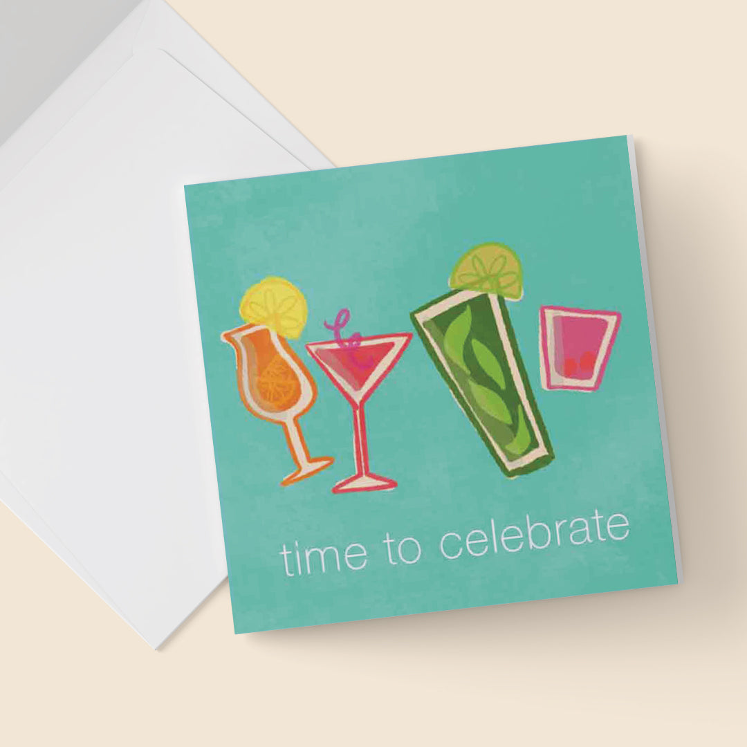 Get ready to raise a glass and join in the festivities with this colourful greeting card designed by She Designs he Prints. The message, "Time to Celebrate," invites friends, family, and loved ones to come together and make unforgettable memories. Whether it's a birthday, anniversary, graduation, or any special occasion, this hand-illustrated card sparks excitement and joy.